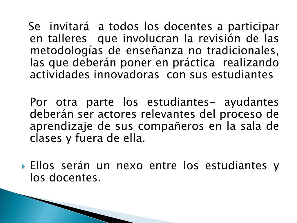 Se invitaráa todos los docentes a participaren talleresqueinvolucran la revisión de lasmetodologías de enseñanza no tradicionales, lasquedeberánponer en prácticarealizandoactividadesinnovadoras con susestudiantes Por otra parte los estudiantes- ayudantes deberán ser actores relevantes del proceso de aprendizaje de sus compañeros en la sala de clases y fuera de ella. • Ellos serán un nexo entre los estudiantes y los docentes.