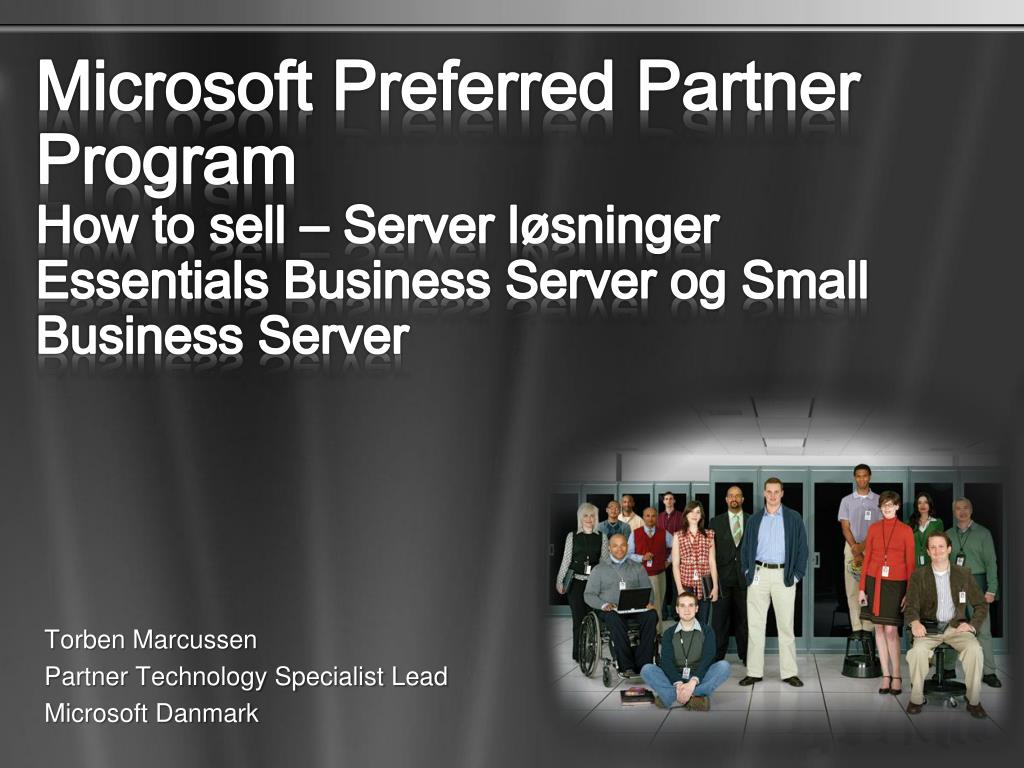 Microsoft Preferred Partner Program How to sell – Server løsninger Essentials Business Server og Small Business Server. Torben Marcussen Partner Technology Specialist Lead Microsoft Danmark.