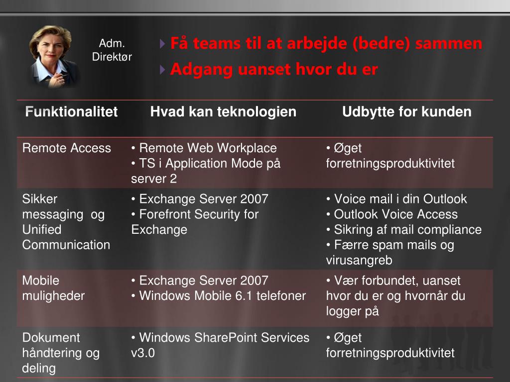 Løftvirksomhedensproduktivitet • Remote Web Workplace • E-mail • Intranet • Adgangtil PC udefra • Windows SharePoint Services 3.0 • Dokumentsamarbejde • Wikis, blogs, sikkerhed pr. dokument • Office Live Small Business integration • Offentligt website • Arbejdsrum