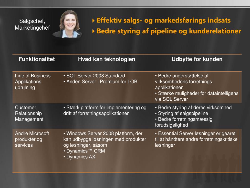 Repetition af behov • Data beskyttelseogreplikering • Sikre at love ogregulativeroverholdes • Sikker mod interne ogeksternetrusler IT chef • Få teams til at arbejde (bedre) sammen • Adganguansethvor du er Adm. Direktør • Bedreforretnings performance ogproduktivitet • Nedbringomkostningerved IT administration • IT somvækstmotor ØkonomiDirektør • Effektivsalgs- ogmarkedsføringsindsats • Bedrestyringaf pipeline ogkunderelationer Salgschef, Marketingchef