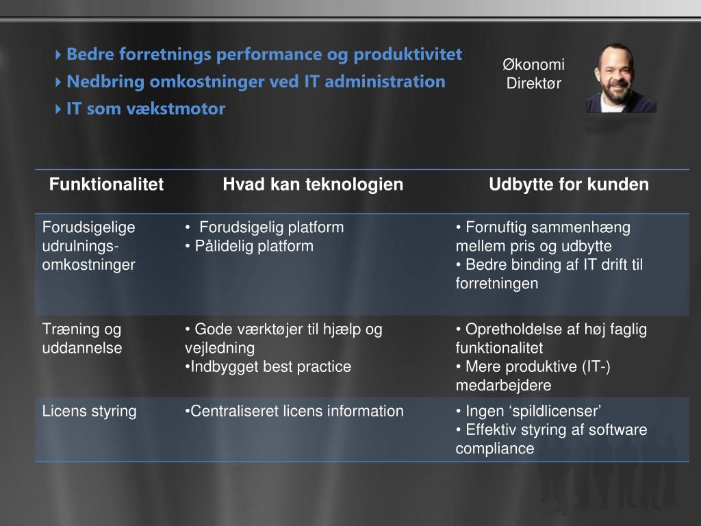 Bedreforretnings performance ogproduktivitet • Nedbringomkostningerved IT administration • IT somvækstmotor ØkonomiDirektør