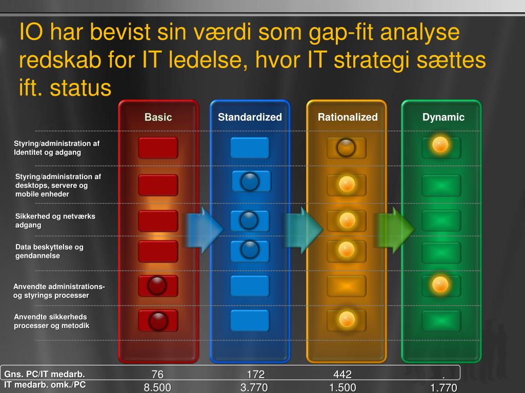 IO har bevist sin værdi som gap-fit analyse redskab for IT ledelse, hvor IT strategi sættes ift. status Basic Standardized Rationalized Dynamic Styring/administration afIdentitetogadgang Styring/administration af desktops, servereog mobile enheder Sikkerhedognetværksadgang Data beskyttelseoggendannelse Anvendte administrations- ogstyrings processer Anvendtesikkerheds processer ogmetodik 172 3.770 442 1.500 76 8.500 . 1.770 Gns. PC/IT medarb. IT medarb. omk./PC