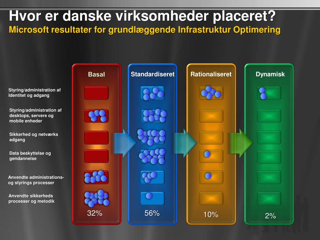 Hvor er danske virksomheder placeret?Microsoft resultater for grundlæggendeInfrastrukturOptimering Basal Standardiseret Rationaliseret Dynamisk Styring/administration afIdentitetogadgang Styring/administration af desktops, servereog mobile enheder Sikkerhedognetværksadgang Data beskyttelseoggendannelse Anvendte administrations- ogstyrings processer Anvendtesikkerheds processer ogmetodik 32% 56% 10% 2%