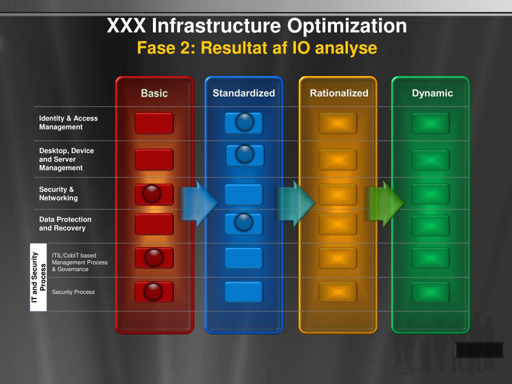 XXX Infrastructure OptimizationFase 2: Resultataf IO analyse Basic Standardized Rationalized Dynamic Identity & Access Management Desktop, Device and Server Management Security & Networking Data Protection and Recovery ITIL/CobIT based Management Process & Governance IT and Security Process Security Process