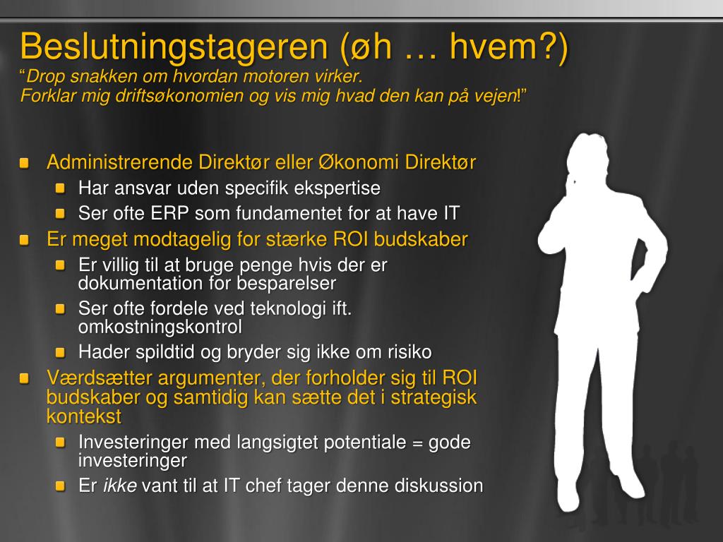 Beslutningstageren (øh … hvem?)“Drop snakkenomhvordanmotorenvirker. Forklarmigdriftsøkonomienogvismighvad den kanpåvejen!” • AdministrerendeDirektørellerØkonomiDirektør • Haransvarudenspecifikekspertise • Ser ofte ERP somfundamentet for at have IT • Ermegetmodtagelig for stærke ROI budskaber • Ervilligtil at brugepengehvisdererdokumentation for besparelser • Ser oftefordelevedteknologiift. omkostningskontrol • Haderspildtidogbrydersig ikkeomrisiko • Værdsætterargumenter, derforholdersig til ROI budskaberogsamtidigkansættedetistrategiskkontekst • Investeringer med langsigtetpotentiale = godeinvesteringer • Erikkevanttil at IT chef tagerdennediskussion