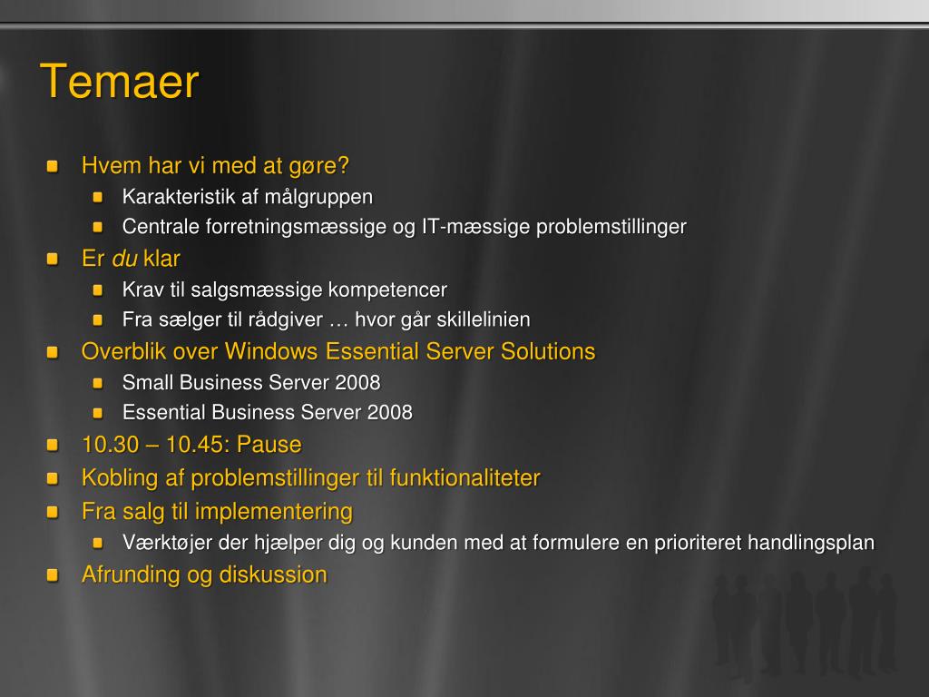 Temaer • Hvem har vi med at gøre • Karakteristik af målgruppen • Centrale forretningsmæssige og IT-mæssige problemstillinger • Er du klar • Krav til salgsmæssige kompetencer • Fra sælger til rådgiver … hvor går skillelinien • Overblik over Windows Essential Server Solutions • Small Business Server 2008 • Essential Business Server 2008 • 10.30 – 10.45: Pause • Kobling af problemstillinger til funktionaliteter • Fra salg til implementering • Værktøjer der hjælper dig og kunden med at formulere en prioriteret handlingsplan • Afrunding og diskussion