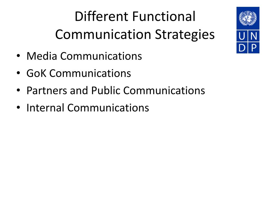 Different Functional Communication Strategies • Media Communications • GoK Communications • Partners and Public Communications • Internal Communications