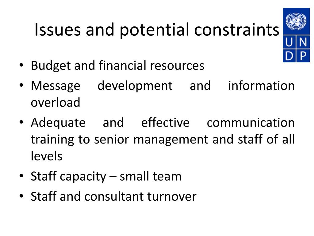 Issues and potential constraints • Budget and financial resources • Message development and information overload • Adequate and effective communication training to senior management and staff of all levels • Staff capacity – small team • Staff and consultant turnover