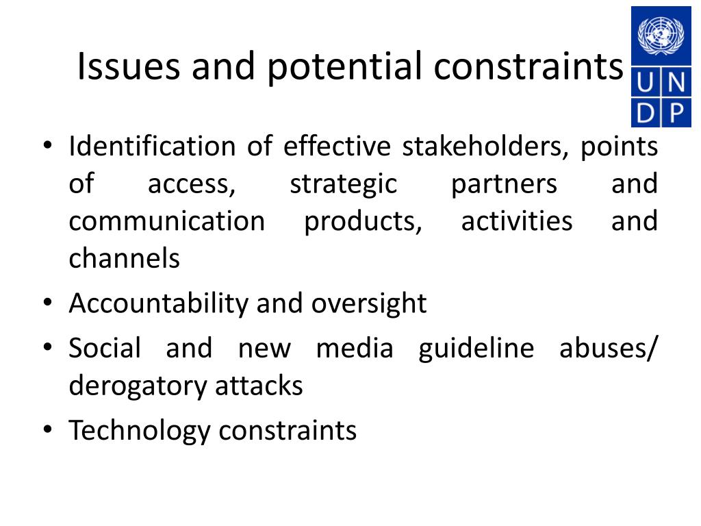Issues and potential constraints • Identification of effective stakeholders, points of access, strategic partners and communication products, activities and channels • Accountability and oversight • Social and new media guideline abuses/ derogatory attacks • Technology constraints