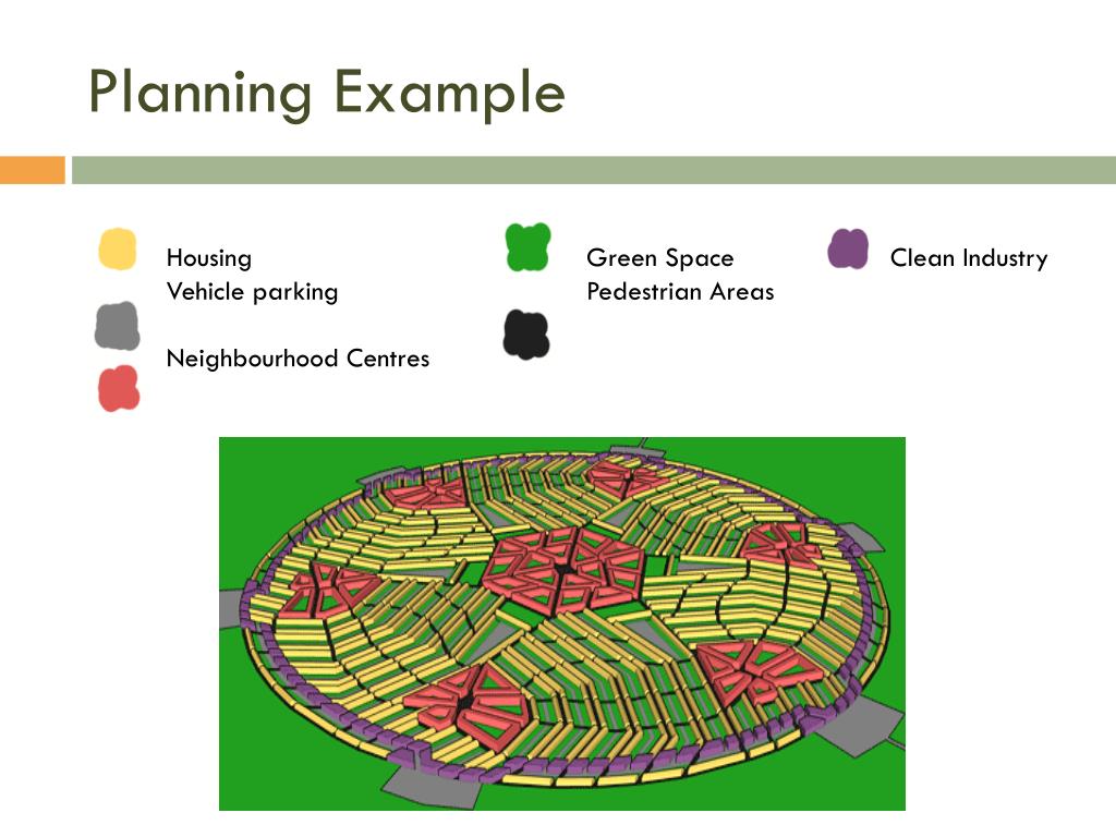 Planning Example Housing Green Space Clean Industry Vehicle parking Pedestrian Areas Neighbourhood Centres
