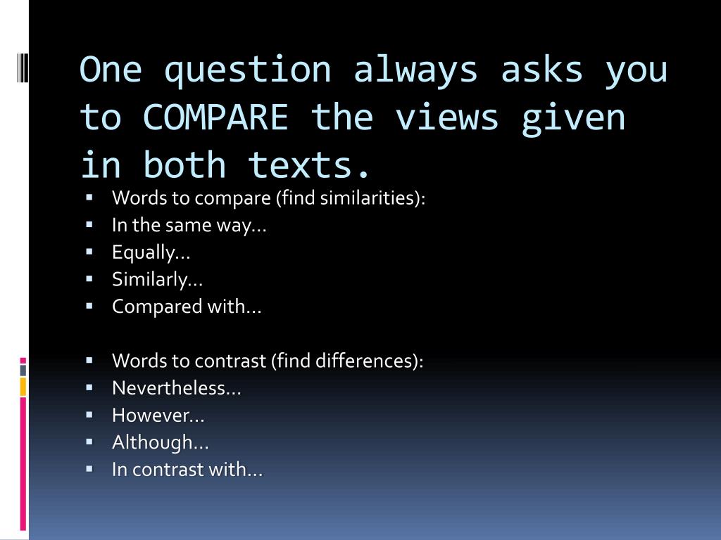 One question always asks you to COMPARE the views given in both texts. • Words to compare (find similarities): • In the same way… • Equally… • Similarly… • Compared with… • Words to contrast (find differences): • Nevertheless… • However… • Although… • In contrast with…