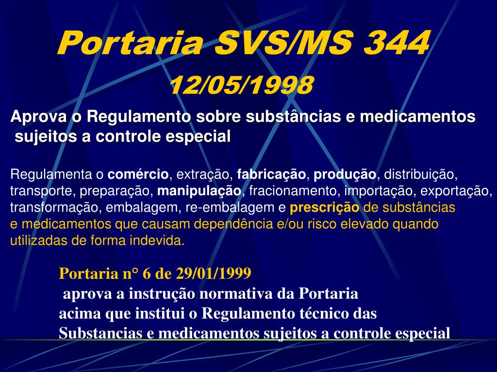 Portaria SVS/MS 344 12/05/1998 Aprova o Regulamento sobre substâncias e medicamentos sujeitos a controle especial Regulamenta o comércio, extração, fabricação, produção, distribuição, transporte, preparação, manipulação, fracionamento, importação, exportação, transformação, embalagem, re-embalagem e prescrição de substâncias e medicamentos que causam dependência e/ou risco elevado quando utilizadas de forma indevida. Portaria n° 6 de 29/01/1999 aprova a instrução normativa da Portaria acima que institui o Regulamento técnico das Substancias e medicamentos sujeitos a controle especial