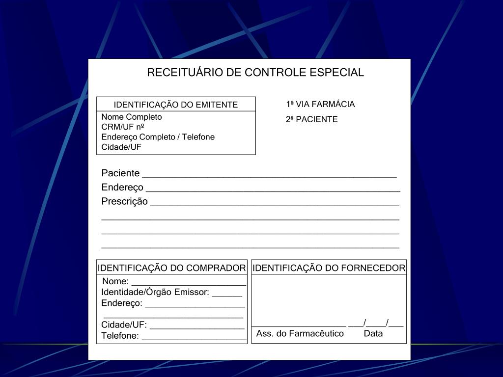 RECEITUÁRIO DE CONTROLE ESPECIAL 1ª VIA FARMÁCIA 2ª PACIENTE IDENTIFICAÇÃO DO EMITENTE Nome Completo CRM/UF nº Endereço Completo / Telefone Cidade/UF Paciente _______________________________________________ Endereço _______________________________________________ Prescrição ______________________________________________ _______________________________________________________ _______________________________________________________ _______________________________________________________ IDENTIFICAÇÃO DO COMPRADOR Nome: _______________________ Identidade/Órgão Emissor: ______ Endereço: ____________________ ____________________________ Cidade/UF: ___________________ Telefone: _____________________ IDENTIFICAÇÃO DO FORNECEDOR ___________________ ___/____/___ Ass. do Farmacêutico Data