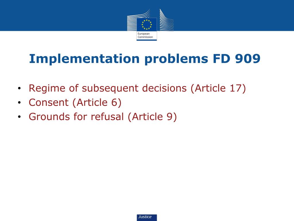 Implementation problems FD 909 • Regime of subsequentdecisions (Article 17) • Consent (Article 6) • Grounds for refusal (Article 9)