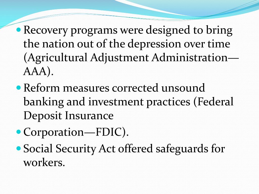 Recovery programs were designed to bring the nation out of the depression over time (Agricultural Adjustment Administration—AAA). • Reform measures corrected unsound banking and investment practices (Federal Deposit Insurance • Corporation—FDIC). • Social Security Act offered safeguards for workers.