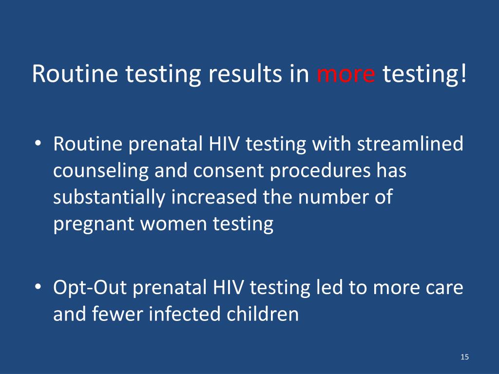 Routine testing results in more testing! • Routine prenatal HIV testing with streamlined counseling and consent procedures has substantially increased the number of pregnant women testing • Opt-Out prenatal HIV testing led to more care and fewer infected children