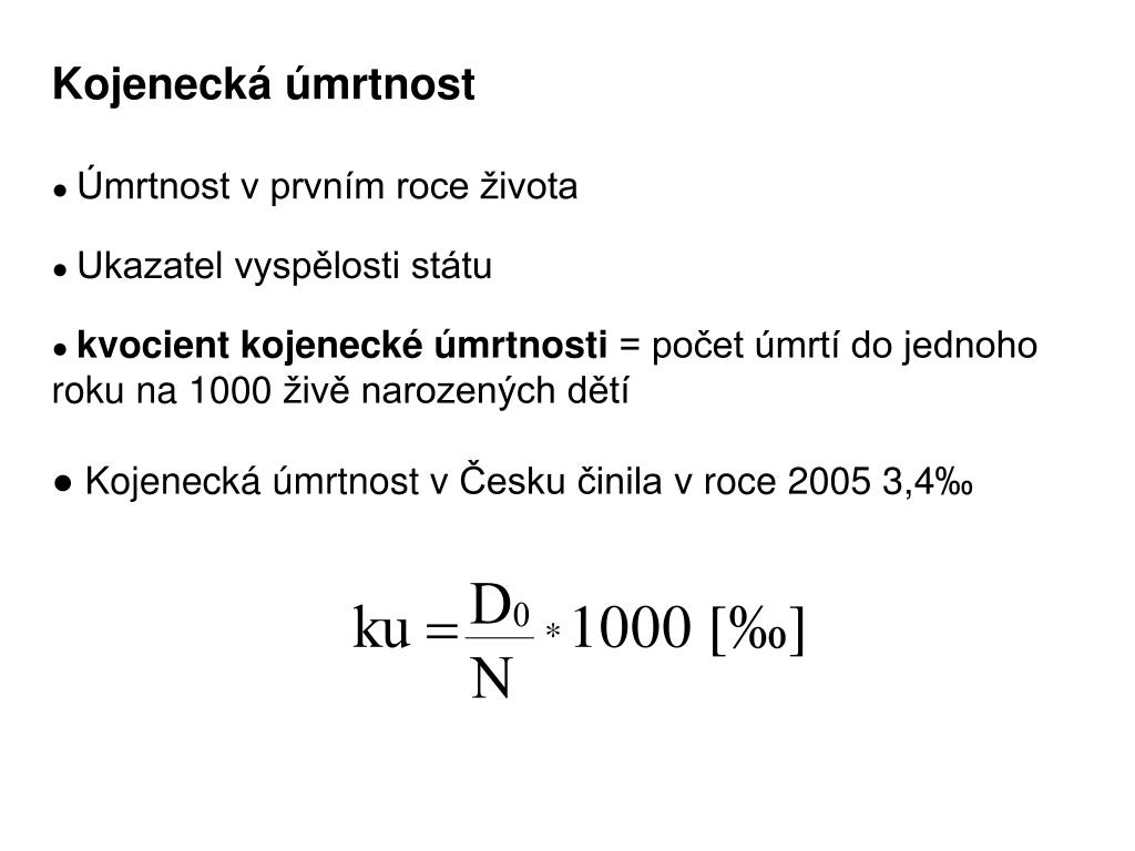 Kojenecká úmrtnost ● Úmrtnost v prvním roce života ● Ukazatel vyspělosti státu ● kvocient kojenecké úmrtnosti= počet úmrtí do jednohoroku na 1000 živěnarozených dětí ● Kojenecká úmrtnost v Českučinila v roce 2005 3,4‰