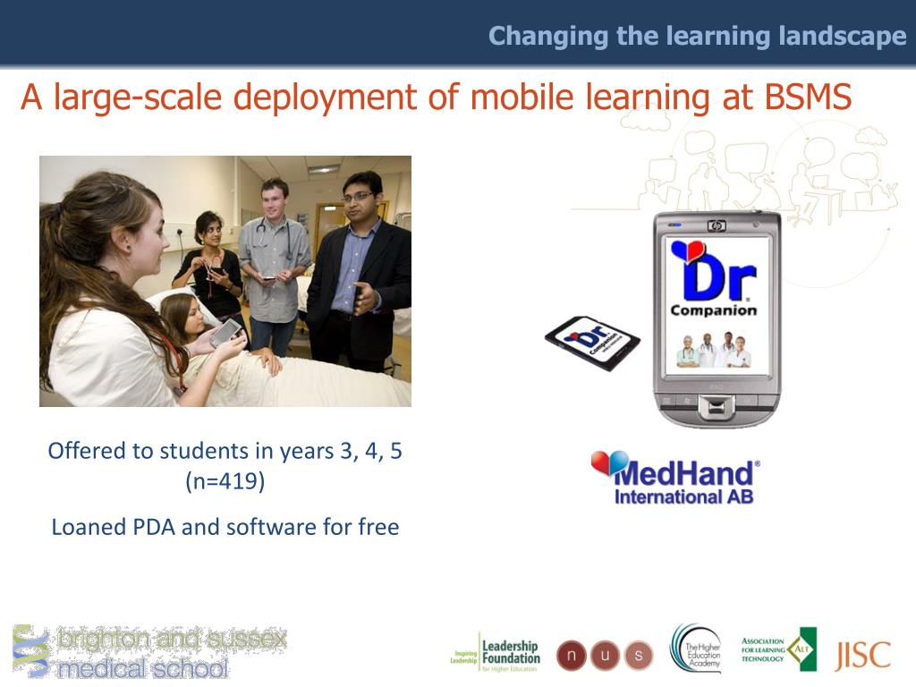 A large-scale deployment of mobile learning at BSMS Offered to students in years 3, 4, 5 (n=419) Loaned PDA and software for free