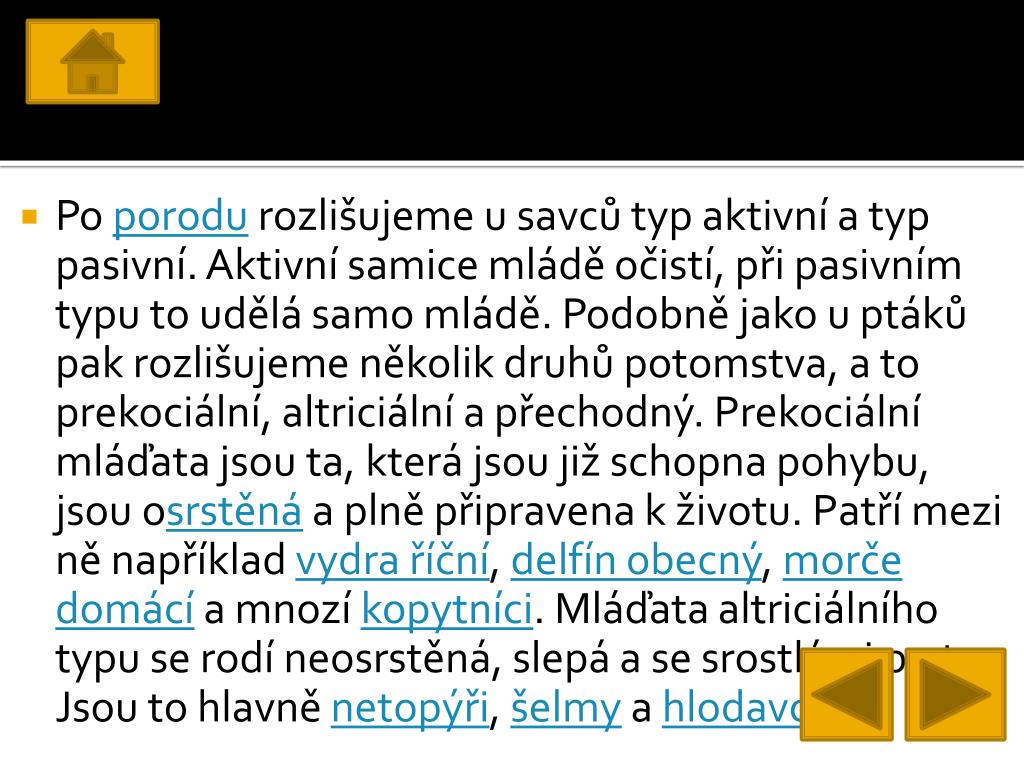 Po porodu rozlišujeme u savců typ aktivní a typ pasivní. Aktivní samice mládě očistí, připasivním typu to udělá samo mládě. Podobnějako u ptákůpak rozlišujeme několikdruhů potomstva, a to prekociální, altriciální a přechodný. Prekociálnímláďatajsou ta, kterájsoujižschopna pohybu, jsouosrstěná a plněpřipravena k životu. Patřímeziněnapříkladvydra říční, delfín obecný, morčedomácí a mnozíkopytníci. Mláďataaltriciálního typu se rodí neosrstěná, slepá a sesrostlými prsty. Jsou to hlavněnetopýři, šelmy a hlodavci.