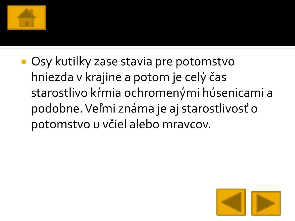Osy kutilky zase stavia pre potomstvo hniezda v krajine a potom je celý čas starostlivo kŕmia ochromenými húsenicami a podobne. Veľmi známa je aj starostlivosť o potomstvo u včiel alebo mravcov.