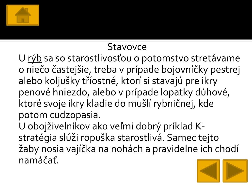 StavovceU rýb sa so starostlivosťou o potomstvo stretávame o niečo častejšie, treba v prípade bojovníčky pestrej alebo koljuškytříostné, ktorí si stavajú pre ikry penové hniezdo, alebo v prípade lopatky dúhové, ktoré svoje ikry kladie do mušlí rybničnej, kde potom cudzopasia.U obojživelníkov ako veľmi dobrý príklad K-stratégia slúži ropuška starostlivá. Samec tejto žaby nosia vajíčka na nohách a pravidelne ich chodí namáčať.