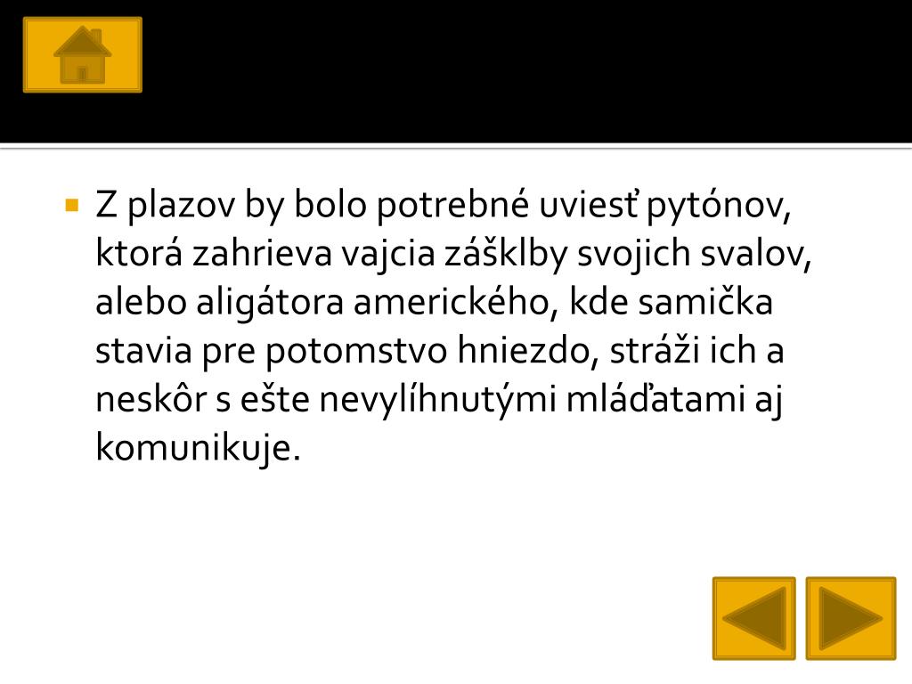 Z plazov by bolo potrebné uviesť pytónov, ktorá zahrieva vajcia zášklby svojich svalov, alebo aligátora amerického, kde samička stavia pre potomstvo hniezdo, stráži ich a neskôr s ešte nevylíhnutými mláďatami aj komunikuje.