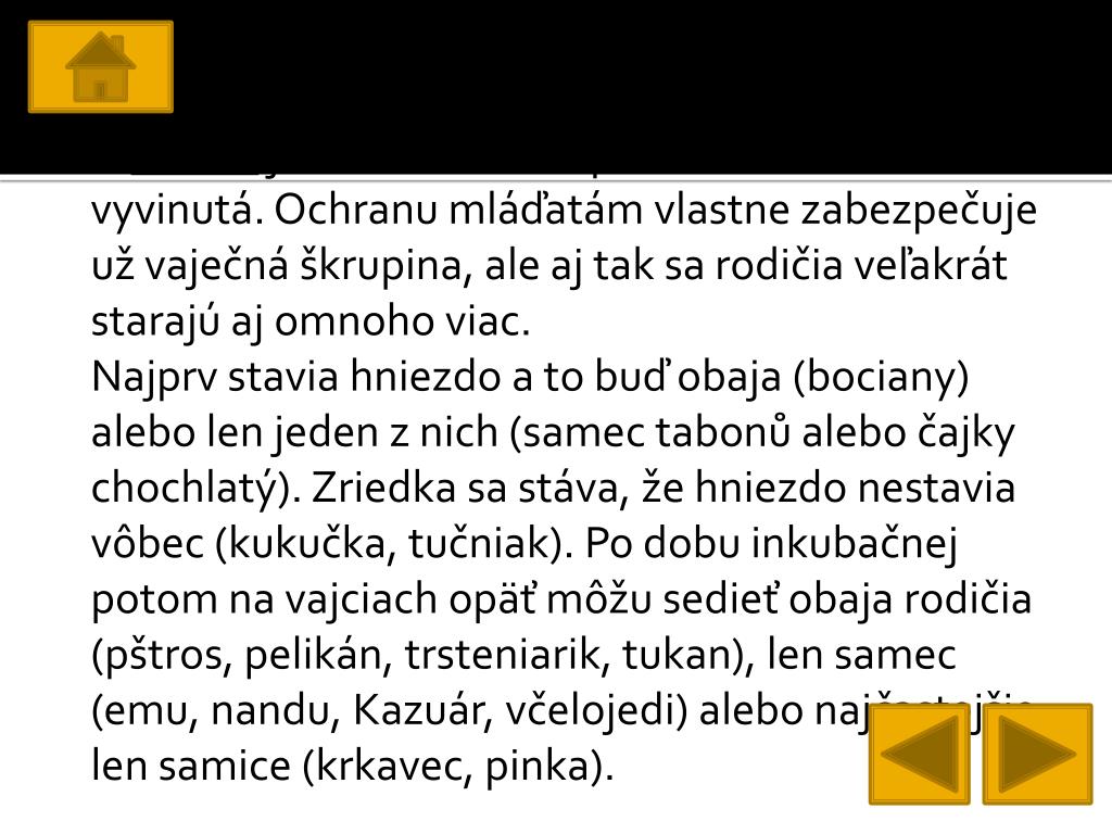 VtákyU vtákov je starostlivosť o potomstvo veľmi vyvinutá. Ochranu mláďatám vlastne zabezpečuje už vaječná škrupina, ale aj tak sa rodičia veľakrát starajú aj omnoho viac.Najprv stavia hniezdo a to buď obaja (bociany) alebo len jeden z nich (samec tabonů alebo čajky chochlatý). Zriedka sa stáva, že hniezdo nestavia vôbec (kukučka, tučniak). Po dobu inkubačnej potom na vajciach opäť môžu sedieť obaja rodičia (pštros, pelikán, trsteniarik, tukan), len samec (emu, nandu, Kazuár, včelojedi) alebo najčastejšie len samice (krkavec, pinka).