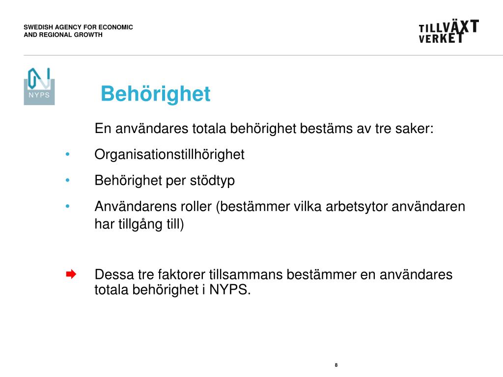 Behörighet En användares totala behörighet bestäms av tre saker: • Organisationstillhörighet • Behörighet per stödtyp • Användarens roller (bestämmer vilka arbetsytor användaren har tillgång till) • Dessa tre faktorer tillsammans bestämmer en användares totala behörighet i NYPS.