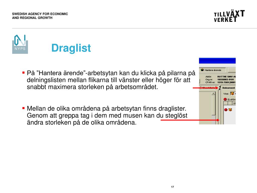 Draglist • På ”Hantera ärende”-arbetsytan kan du klicka på pilarna på delningslisten mellan flikarna till vänster eller höger för att snabbt maximera storleken på arbetsområdet. • Mellan de olika områdena på arbetsytan finns draglister. Genom att greppa tag i dem med musen kan du steglöst ändra storleken på de olika områdena.