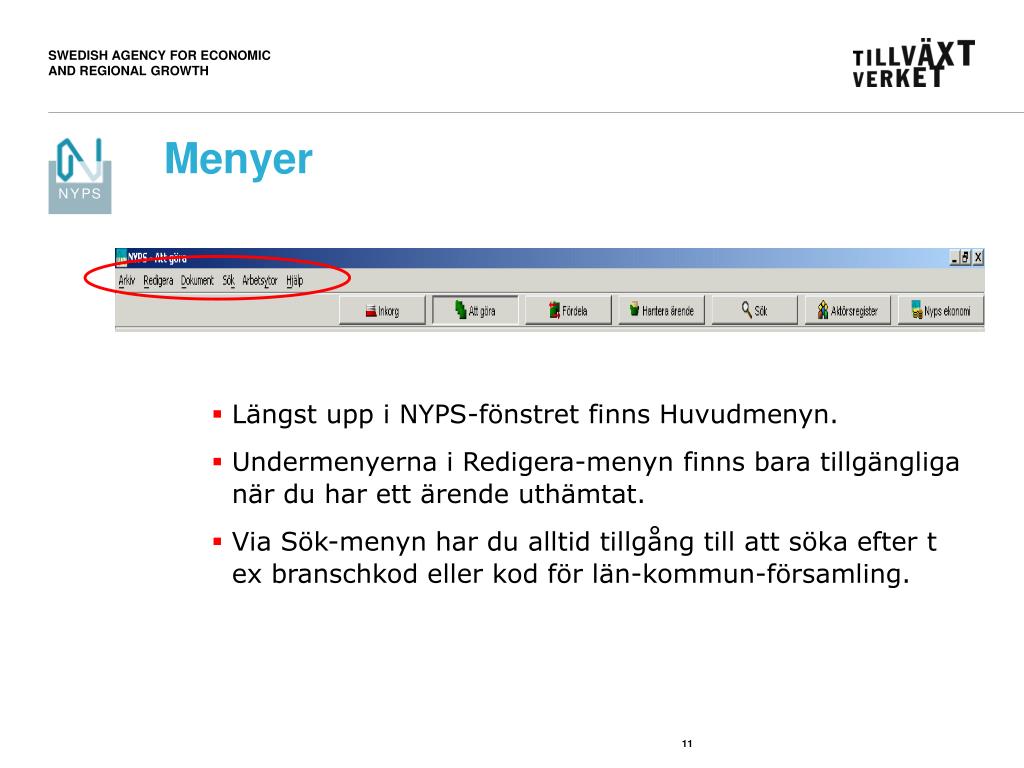 Menyer • Längst upp i NYPS-fönstret finns Huvudmenyn. • Undermenyerna i Redigera-menyn finns bara tillgängliga när du har ett ärende uthämtat. • Via Sök-menyn har du alltid tillgång till att söka efter t ex branschkod eller kod för län-kommun-församling.