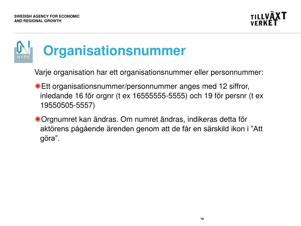 Organisationsnummer Varje organisation har ett organisationsnummer eller personnummer: • Ett organisationsnummer/personnummer anges med 12 siffror, inledande 16 för orgnr (t ex 16555555-5555) och 19 för persnr (t ex 19550505-5557) • Orgnumret kan ändras. Om numret ändras, indikeras detta för aktörens pågående ärenden genom att de får en särskild ikon i ”Att göra”.