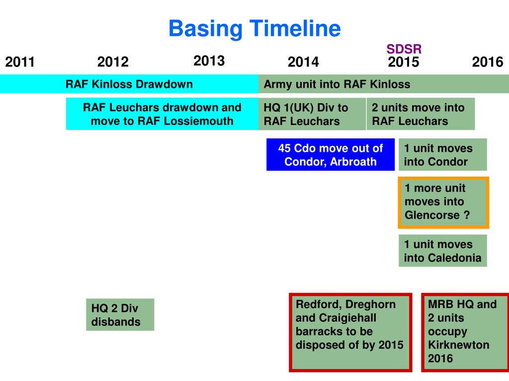 Basing Timeline SDSR 2013 2012 2011 2014 2015 2016 RAF Kinloss Drawdown Army unit into RAF Kinloss RAF Leuchars drawdown and move to RAF Lossiemouth 2 units move into RAF Leuchars HQ 1(UK) Div to RAF Leuchars 45 Cdo move out of Condor, Arbroath 1 unit moves into Condor 1 more unit moves into Glencorse ? 1 unit moves into Caledonia Redford, Dreghorn and Craigiehall barracks to be disposed of by 2015 MRB HQ and 2 units occupy Kirknewton 2016 HQ 2 Div disbands