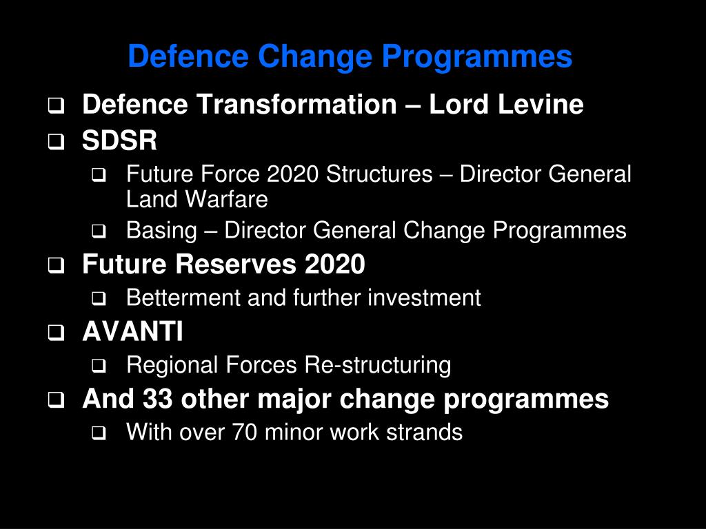 Defence Change Programmes Defence Transformation – Lord Levine SDSR Future Force 2020 Structures – Director General Land Warfare Basing – Director General Change Programmes Future Reserves 2020 Betterment and further investment AVANTI Regional Forces Re-structuring And 33 other major change programmes With over 70 minor work strands