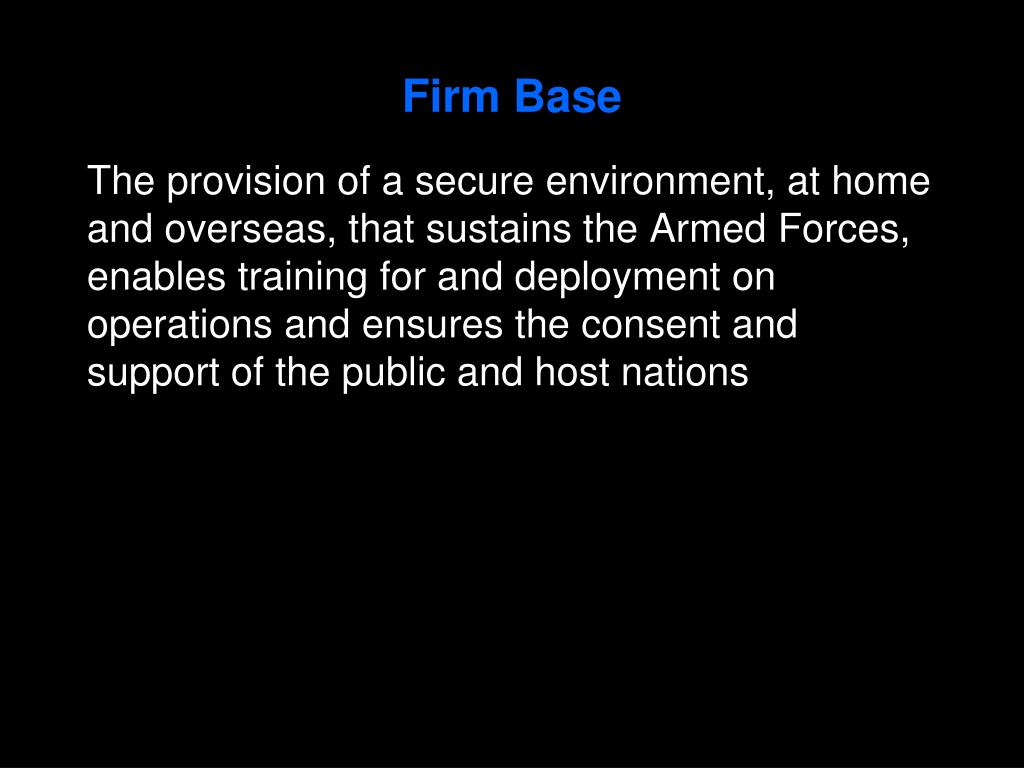 Firm Base The provision of a secure environment, at home and overseas, that sustains the Armed Forces, enables training for and deployment on operations and ensures the consent and support of the public and host nations