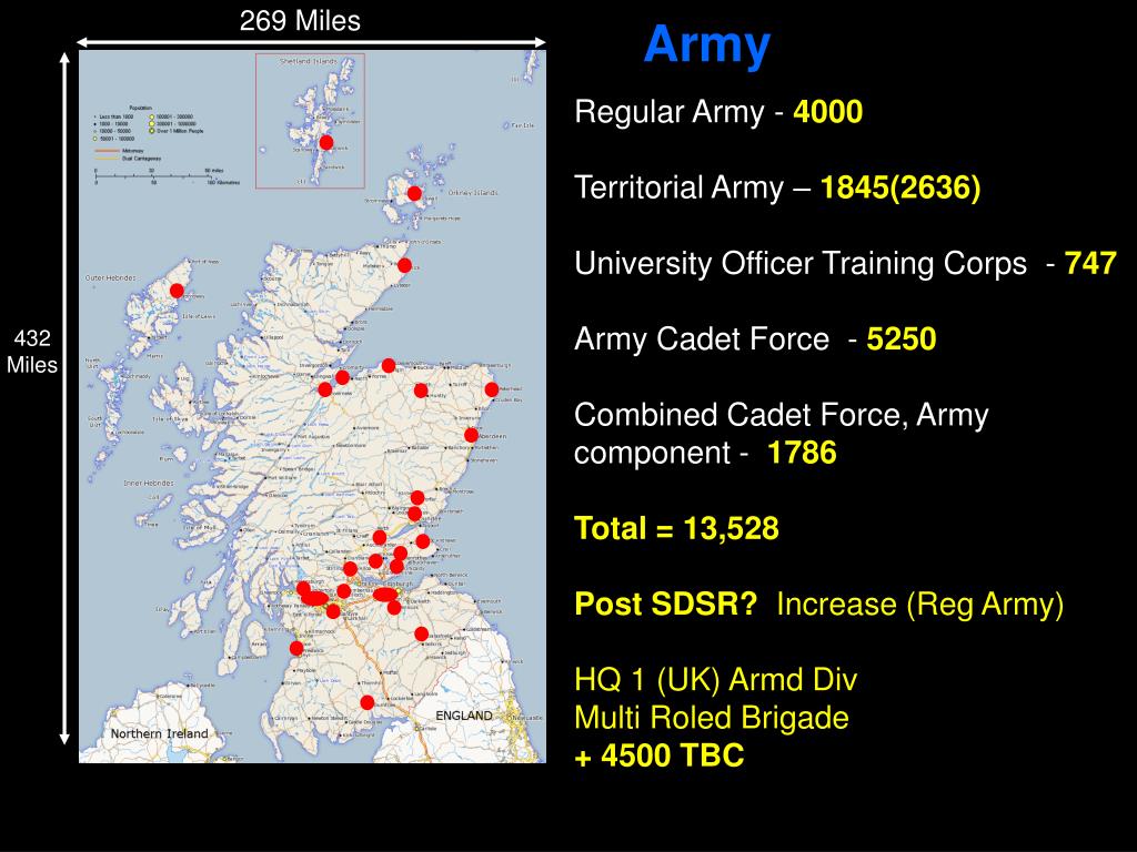 269 Miles Army 1 Regular Army - 4000 Territorial Army – 1845(2636) University Officer Training Corps - 747 Army Cadet Force - 5250 Combined Cadet Force, Army component - 1786 Total = 13,528 Post SDSR? Increase (Reg Army) HQ 1 (UK) Armd Div Multi Roled Brigade + 4500 TBC 432 Miles