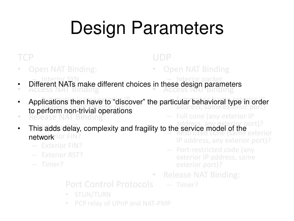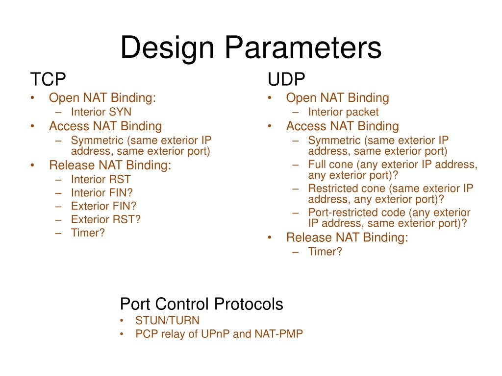 Design Parameters TCP • Open NAT Binding: • Interior SYN • Access NAT Binding • Symmetric (same exterior IP address, same exterior port) • Release NAT Binding: • Interior RST • Interior FIN? • Exterior FIN? • Exterior RST? • Timer? UDP • Open NAT Binding • Interior packet • Access NAT Binding • Symmetric (same exterior IP address, same exterior port) • Full cone (any exterior IP address, any exterior port)? • Restricted cone (same exterior IP address, any exterior port)? • Port-restricted code (any exterior IP address, same exterior port)? • Release NAT Binding: • Timer? • Port Control Protocols • STUN/TURN • PCP relay of UPnP and NAT-PMP