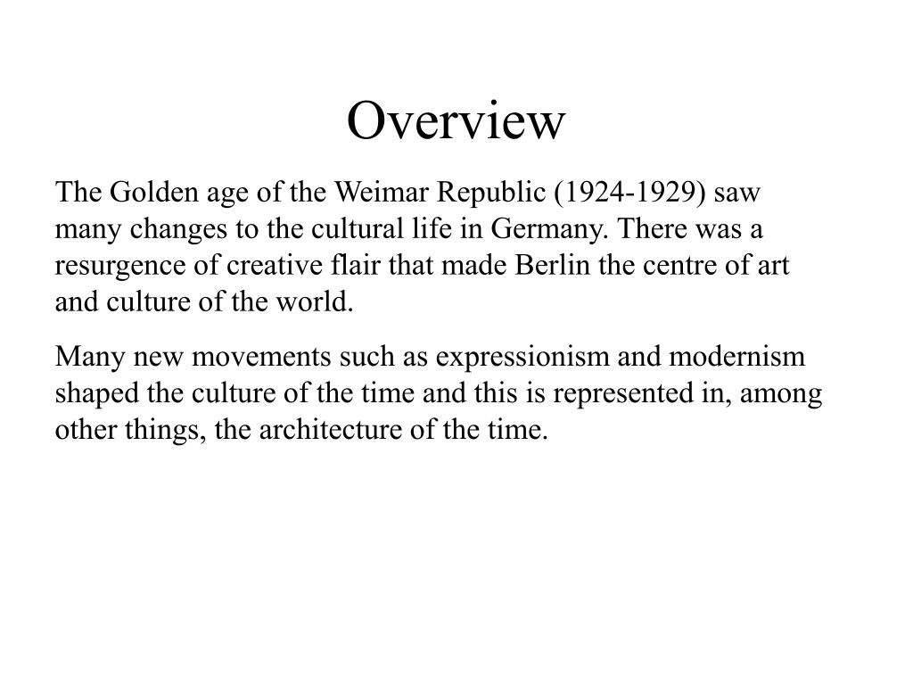 Overview The Golden age of the Weimar Republic (1924-1929) saw many changes to the cultural life in Germany. There was a resurgence of creative flair that made Berlin the centre of art and culture of the world. Many new movements such as expressionism and modernism shaped the culture of the time and this is represented in, among other things, the architecture of the time.