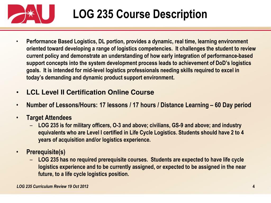 LOG 235 Course Description • Performance Based Logistics, DL portion, provides a dynamic, real time, learning environment oriented toward developing a range of logistics competencies. It challenges the student to review current policy and demonstrate an understanding of how early integration of performance-based support concepts into the system development process leads to achievement of DoD’s logistics goals. It is intended for mid-level logistics professionals needing skills required to excel in today’s demanding and dynamic product support environment. • LCL Level II Certification Online Course • Number of Lessons/Hours: 17 lessons / 17 hours / Distance Learning – 60 Day period • Target Attendees • LOG 235 is for military officers, O-3 and above; civilians, GS-9 and above; and industry equivalents who are Level I certified in Life Cycle Logistics. Students should have 2 to 4 years of acquisition and/or logistics experience. • Prerequisite(s) • LOG 235 has no required prerequisite courses. Students are expected to have life cycle logistics experience and to be currently assigned, or expected to be assigned in the near future, to a life cycle logistics position.