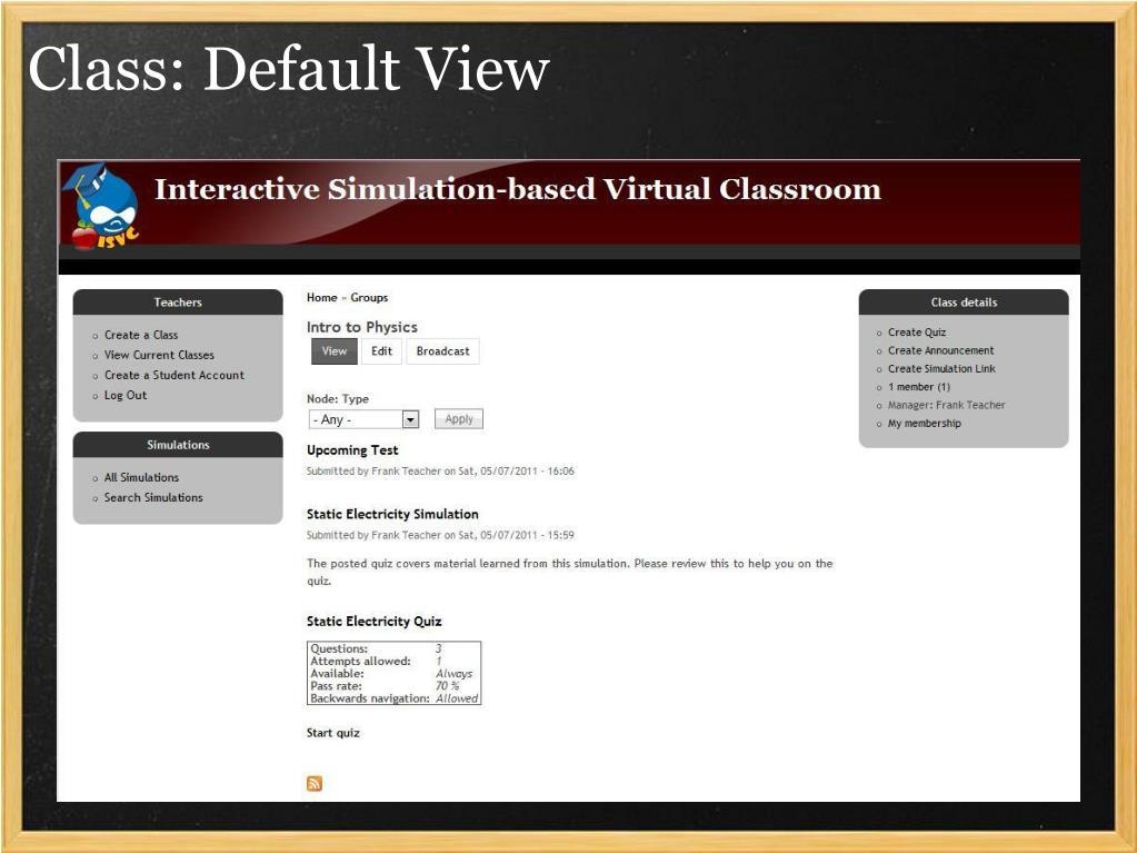 ISVC: Features • Classes • Quiz/Homework Creator. • Content/Announcement Creator. • Classes can be public or private. • Content posted to class will appear on a centralized page. • Simulation Database • Users can search through simulations. • Simulations are tagged with key words for easy sorting and searching. • Different Interface for Students and Teachers.