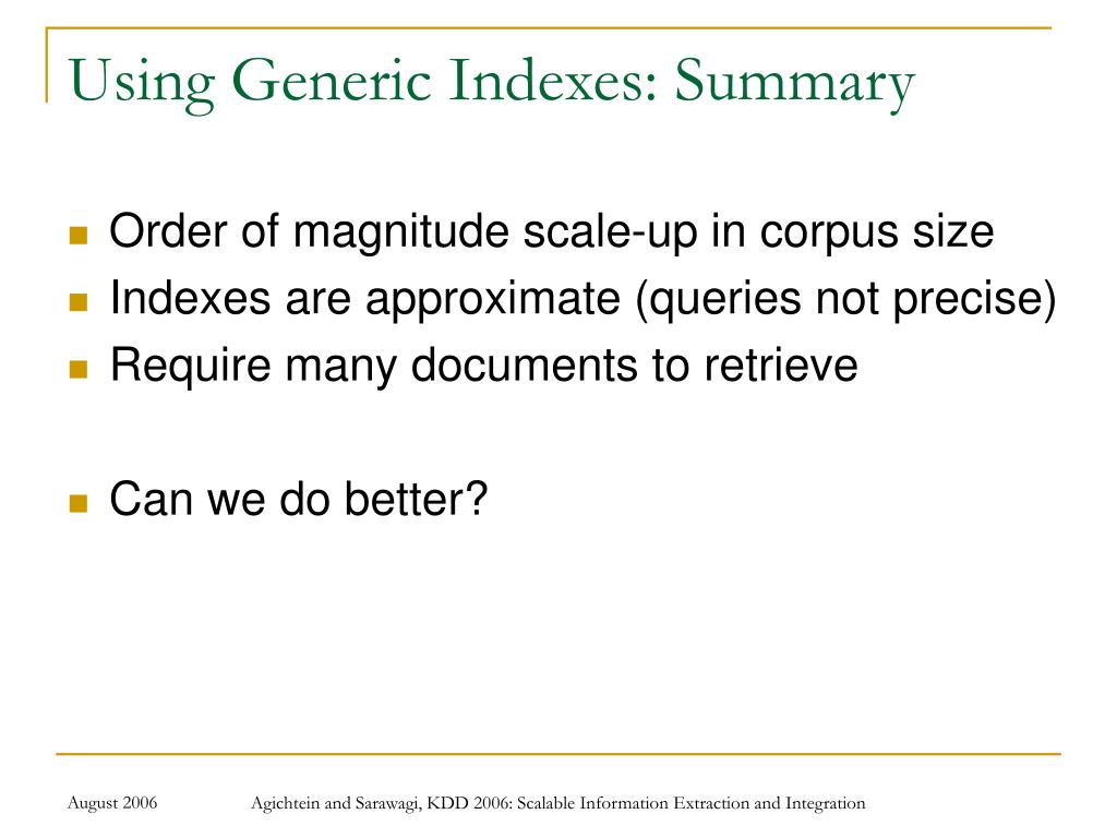 Using Generic Indexes: Summary • Order of magnitude scale-up in corpus size • Indexes are approximate (queries not precise) • Require many documents to retrieve • Can we do better? Agichtein and Sarawagi, KDD 2006: Scalable Information Extraction and Integration
