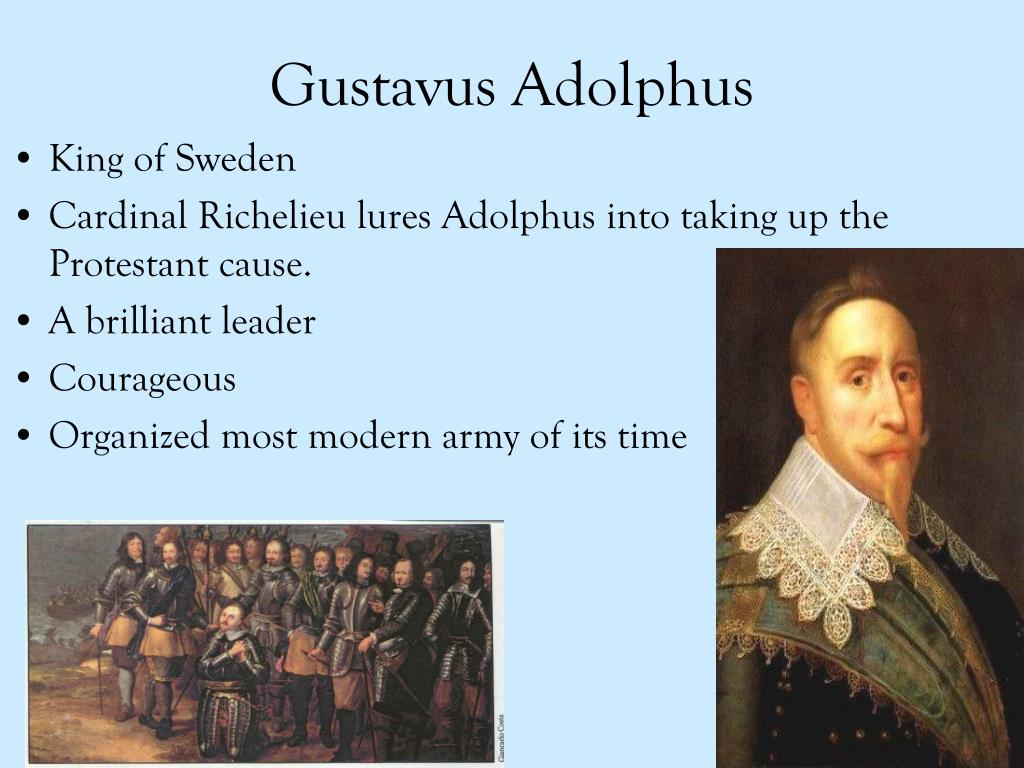 Gustavus Adolphus • King of Sweden • Cardinal Richelieu lures Adolphus into taking up the Protestant cause. • A brilliant leader • Courageous • Organized most modern army of its time