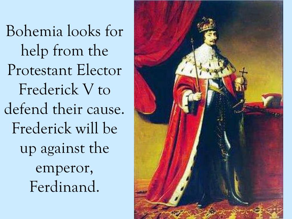 Bohemia looks for help from the Protestant Elector Frederick V to defend their cause. Frederick will be up against the emperor, Ferdinand.