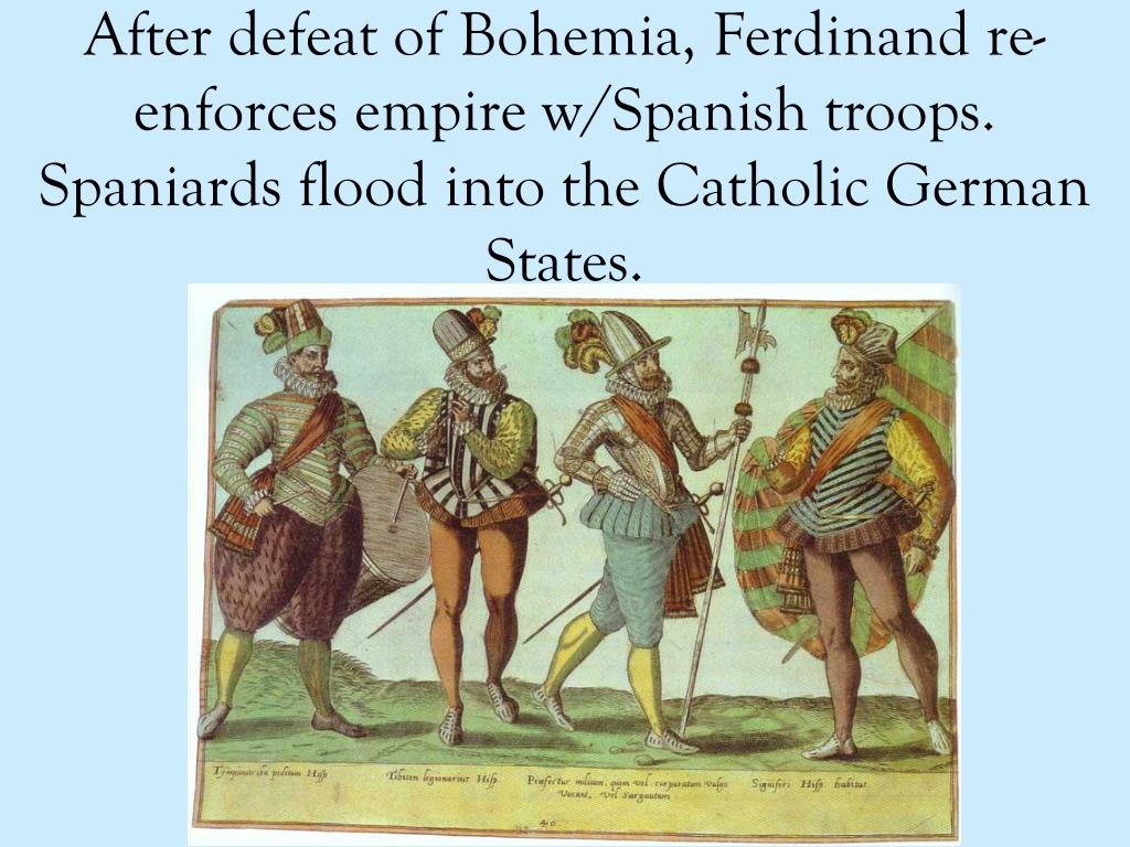 After defeat of Bohemia, Ferdinand re-enforces empire w/Spanish troops. Spaniards flood into the Catholic German States.
