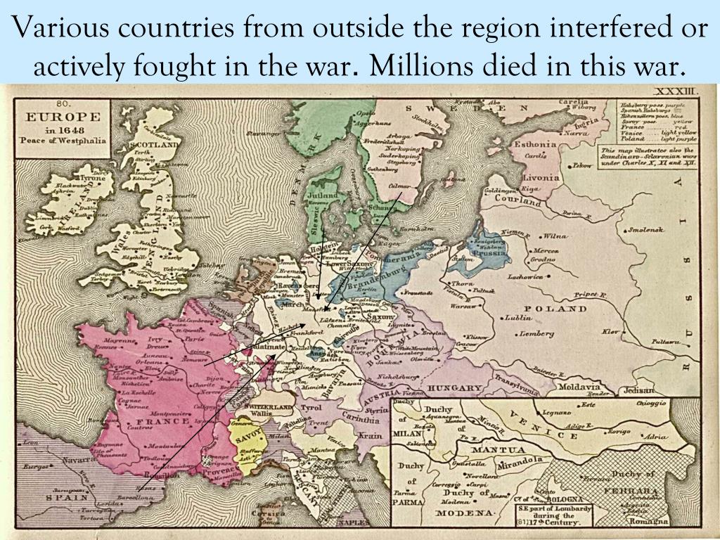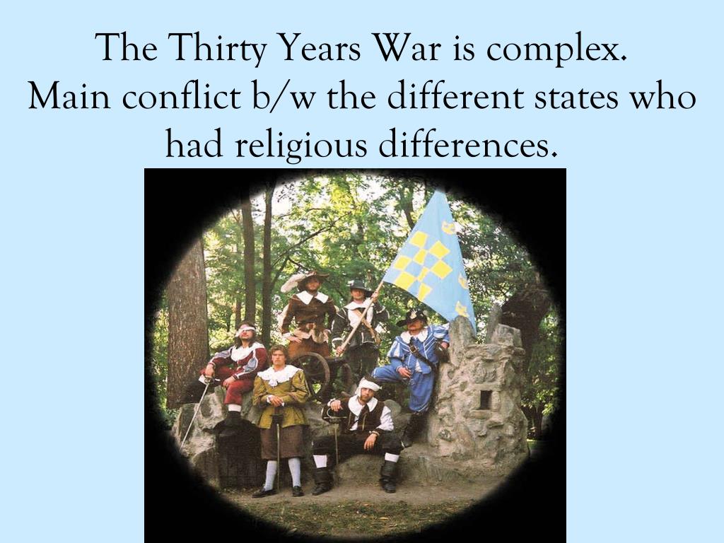 The Thirty Years War is complex. Main conflict b/w the different states who had religious differences.