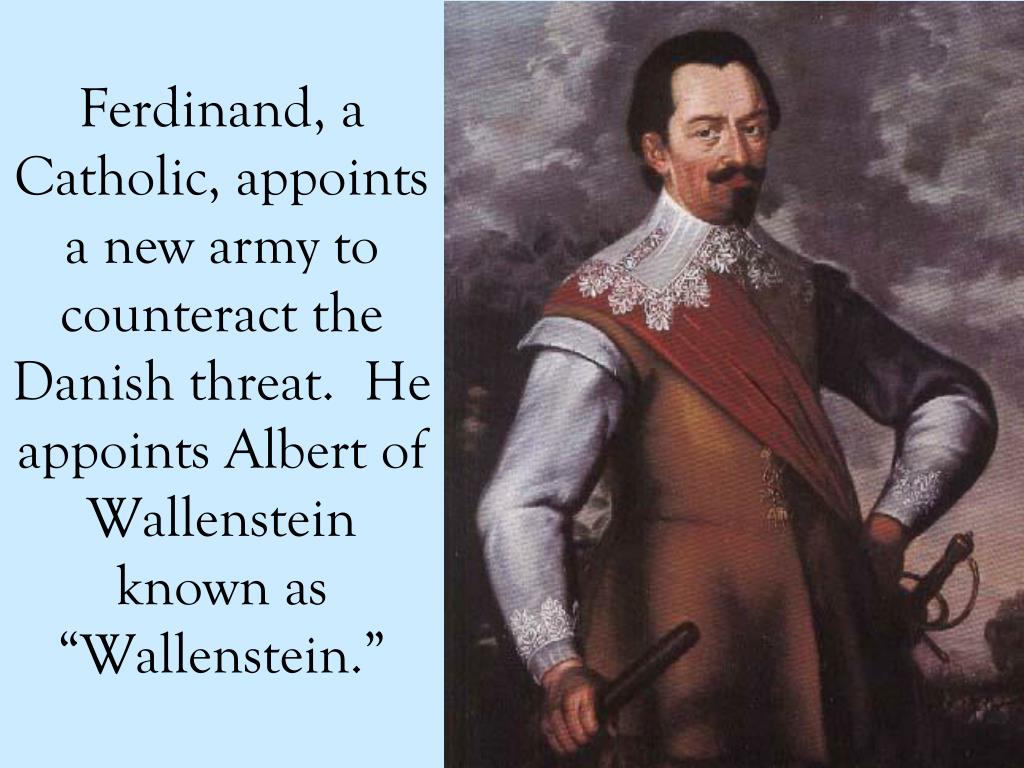 Ferdinand, a Catholic, appoints a new army to counteract the Danish threat. He appoints Albert of Wallenstein known as “Wallenstein.”