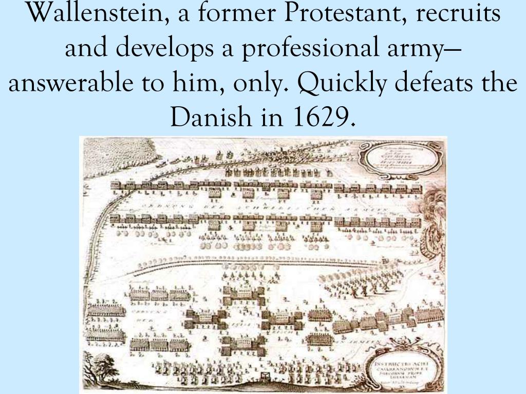 Wallenstein, a former Protestant, recruits and develops a professional army—answerable to him, only. Quickly defeats the Danish in 1629.