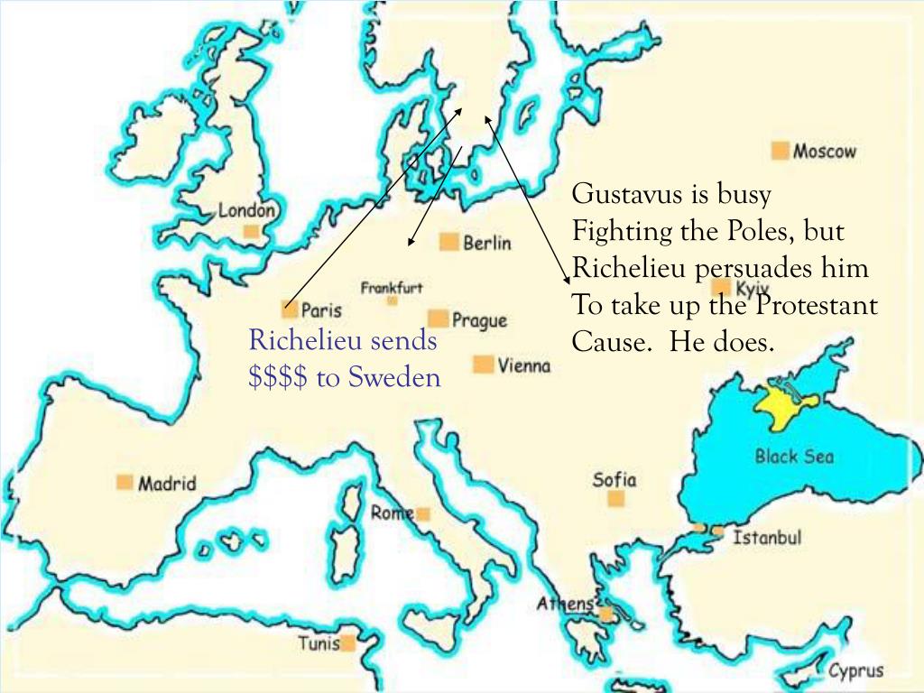 Gustavus is busy Fighting the Poles, but Richelieu persuades him To take up the Protestant Cause. He does. Richelieu sends $$$$ to Sweden