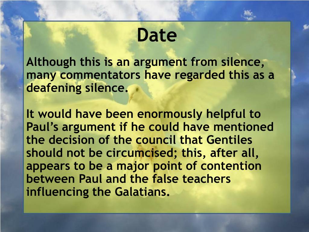 Date • Although this is an argument from silence, many commentators have regarded this as a deafening silence. • It would have been enormously helpful to Paul’s argument if he could have mentioned the decision of the council that Gentiles should not be circumcised; this, after all, appears to be a major point of contention between Paul and the false teachers influencing the Galatians.