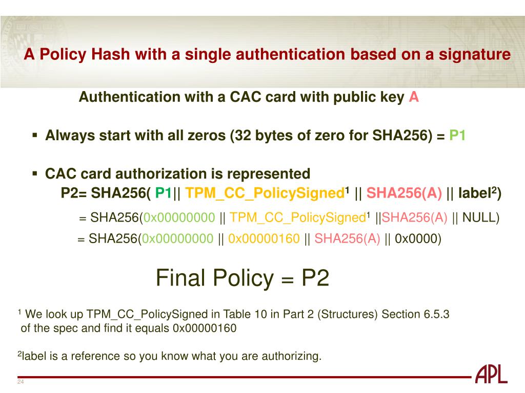 A Policy Hash with a single authentication based on a signature Authentication with a CAC card with public key A • Always start with all zeros (32 bytes of zero for SHA256) = P1 • CAC card authorization is represented P2= SHA256( P1|| TPM_CC_PolicySigned1 || SHA256(A) || label2) = SHA256(0x00000000 || TPM_CC_PolicySigned1 ||SHA256(A) || NULL) = SHA256(0x00000000 || 0x00000160|| SHA256(A) || 0x0000) • Final Policy = P2 1 We look up TPM_CC_PolicySigned in Table 10 in Part 2 (Structures) Section 6.5.3 of the spec and find it equals 0x00000160 2label is a reference so you know what you are authorizing.