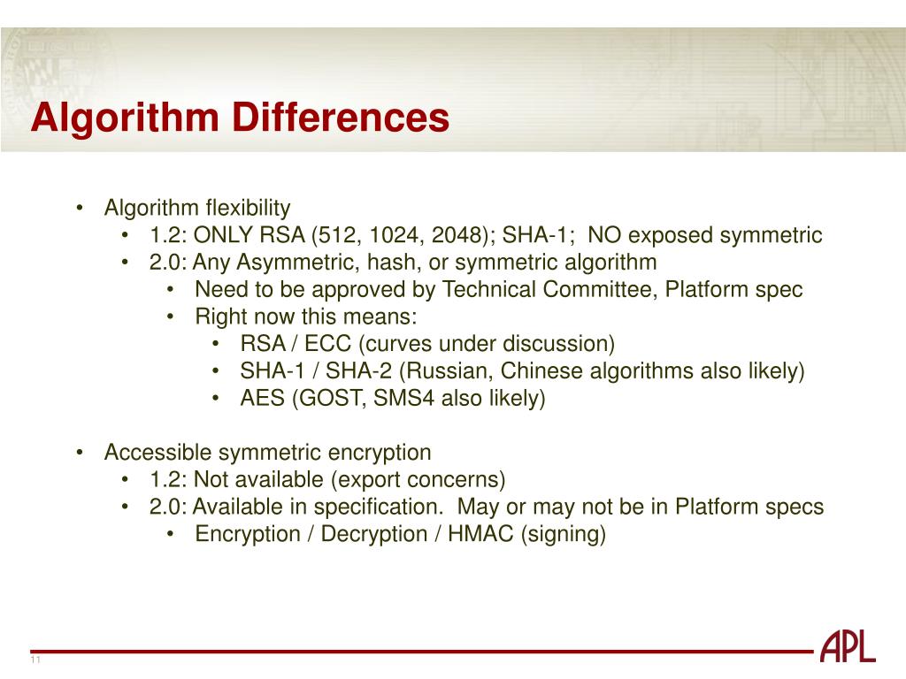 Algorithm Differences • Algorithm flexibility • 1.2: ONLY RSA (512, 1024, 2048); SHA-1; NO exposed symmetric • 2.0: Any Asymmetric, hash, or symmetric algorithm • Need to be approved by Technical Committee, Platform spec • Right now this means: • RSA / ECC (curves under discussion) • SHA-1 / SHA-2 (Russian, Chinese algorithms also likely) • AES (GOST, SMS4 also likely) • Accessible symmetric encryption • 1.2: Not available (export concerns) • 2.0: Available in specification. May or may not be in Platform specs • Encryption / Decryption / HMAC (signing)